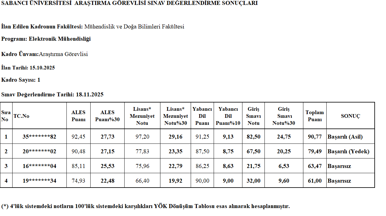 EE Araştırma Görevlisi Sınav Değerlendirme Sonuçları