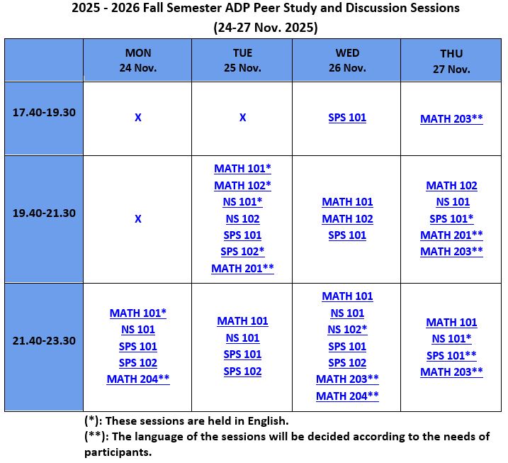 Academic Support Program (ADP/ASP), provides support and guidance in an enjoyable learning environment. The sessions are based on collaboration with your peers and aim to develop your critical thinking, communication, and study skills. You may attend the sessions to improve your academic success in MATH 101, MATH 102, MATH 201, MATH 203, MATH 204, NS 101, NS 102, SPS 101, and SPS 102 courses. Write to us at adp@sabanciuniv.edu for your special needs.