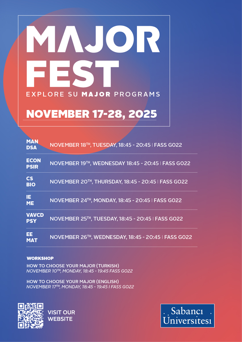 Daha fazla bilgi için bizimle iletişime geçebilirsiniz: majorfest@sabanciuniv.edu veya bagem@sabanciuniv.edu.