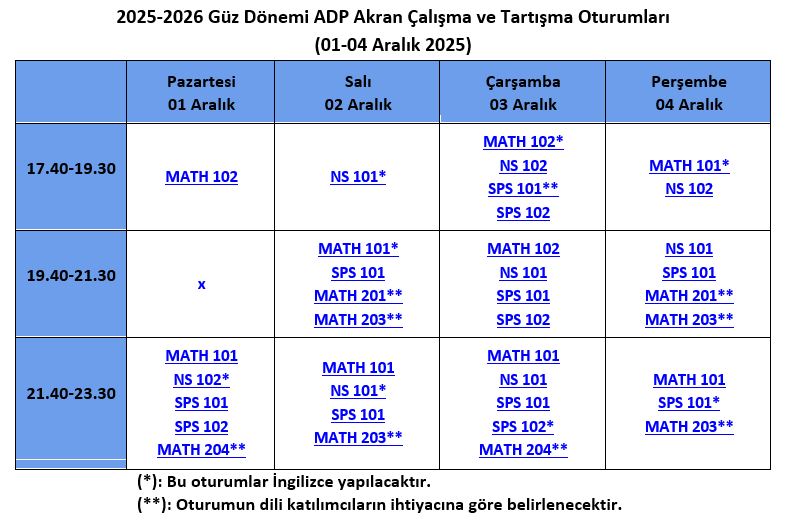 Akademik Destek Programı (ADP/ASP), öğrenme sürecini daha zevkli kılacak, çalışma veriminizi ve başarınızı arttırmaya yönelik oturumlar düzenler. Bu oturumlar, akran dayanışması prensibine dayanır ve eleştirel düşünme, iletişim ve çalışma becerilerinizi geliştirmeyi amaçlar. MATH 101, MATH 102, MATH 201, MATH 203, MATH 204, NS 101, NS 102, SPS 101 ve SPS 102 derslerindeki akademik başarınızı arttırmak için oturumlarımıza katılabilirsiniz.